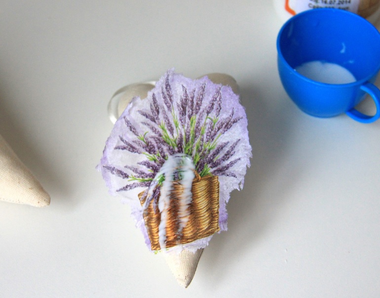 У меня в данном случае салфетка приклеилась со складками. Но это отвечает моей идее прованса, из складок я сделаю потом потертости:)))