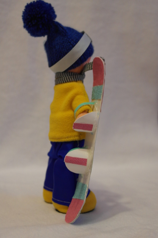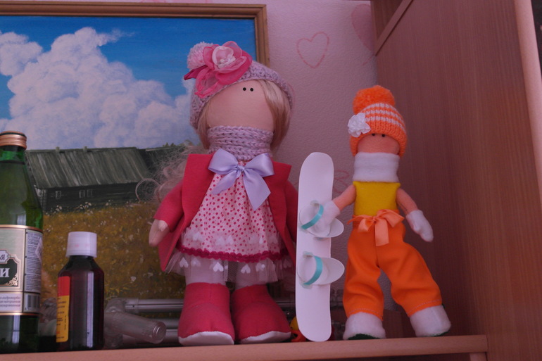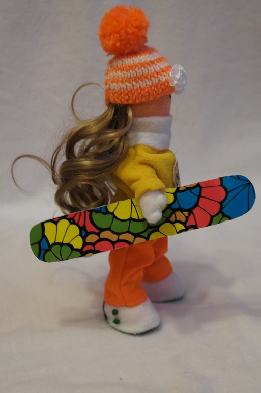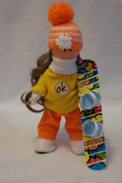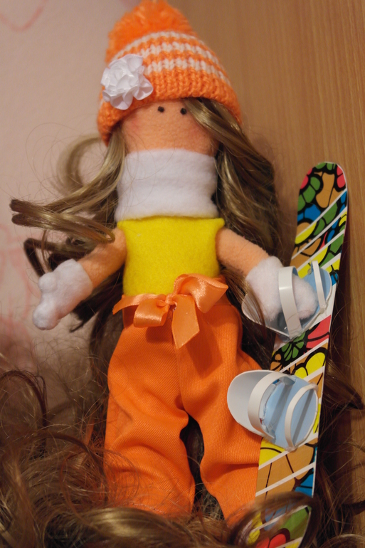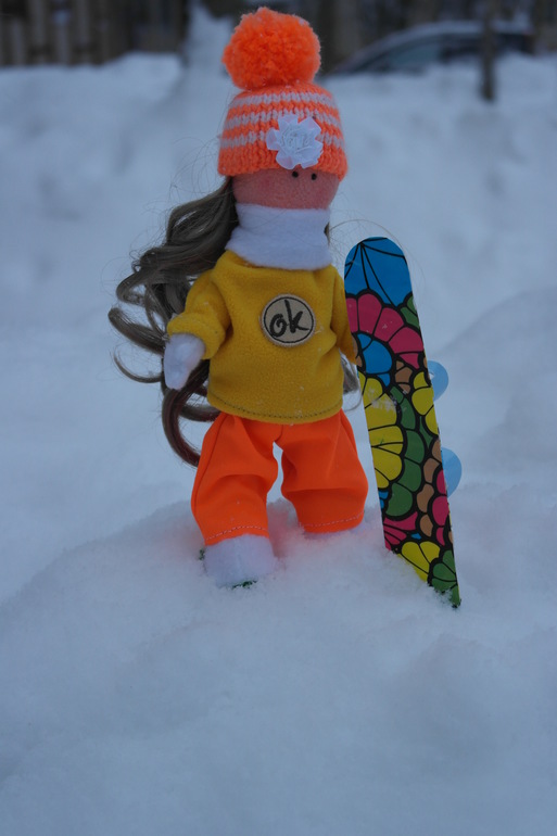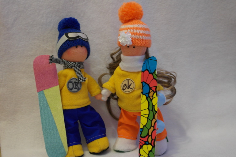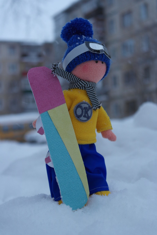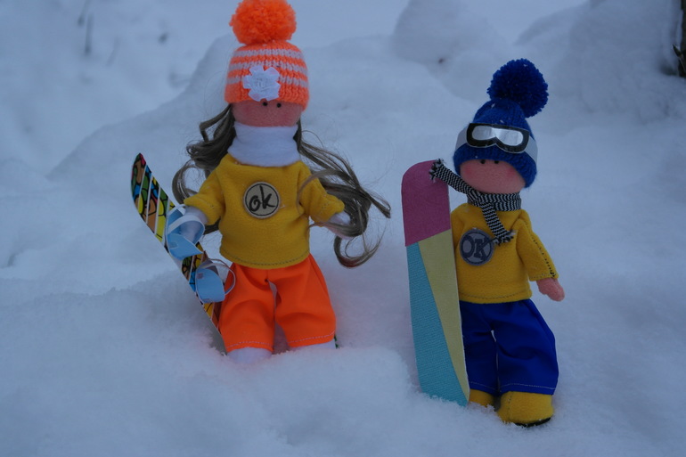 Недавно по обмену я получила красивую куклу Снежку. Поделилась своей радостью с друзьями. А моя сестра решила, что это я сама сшила. И она очень стала просить, чтобы я ей сшила две такие же.Так получилось, что моей сестре очень захотелось подарить на свадьбу двух кукол большеножек-сноубордистов. Я ей объясняю, что шить их не умею. Но попробую договориться. По почте же договориться не удалось, так как сроки очень маленькие (меньше недели на все). Что делать? Давно я мечтала попробовать сшить такую куклу, вот он шанс попробовать. Тканей у нас в магазинах нет (никакого телесного трикотажа), шила из того, что было. Очень сомневалась, что у меня выйдет что то хорошее. Но я ночами очень старалась и трудилась (днем нереально, работа, ребенок, требующий много внимания), много делала выкроек, расчетов, шила, перешивала, выкидывала.... несколько раз хотела все забросить..... Но, все таки довела дело до конца. По просьбе сестры куколки небольшие, всего 22 см ростом. Но маленькие делать очень сложно. Волосы и сноуборд помогал мне делать любимый муж! Спасибо ему огромное! За помощь, за понимание, за поддержку и, даже, за то, что терпел шум швейной машинки по ночам)