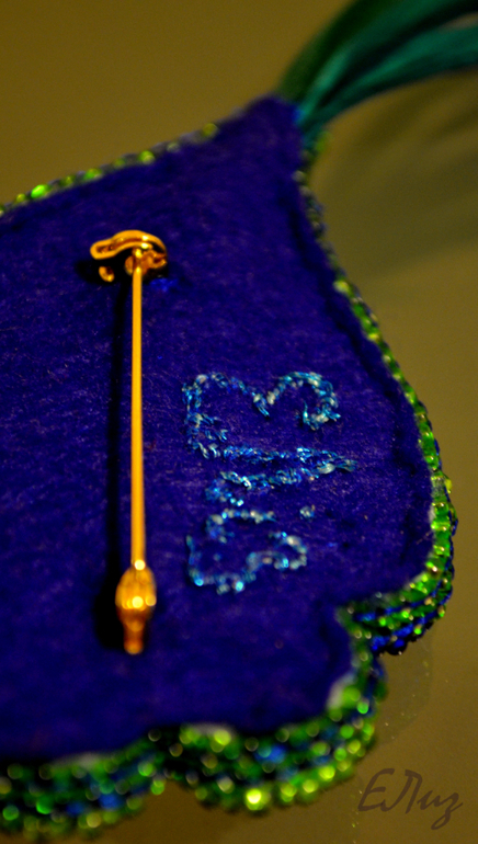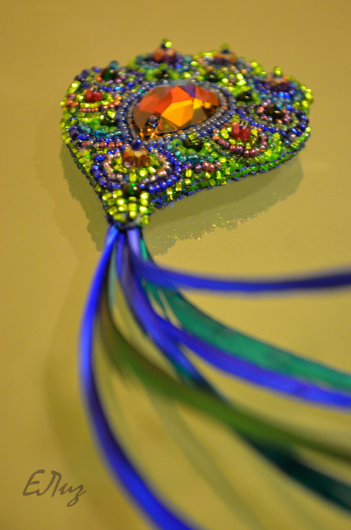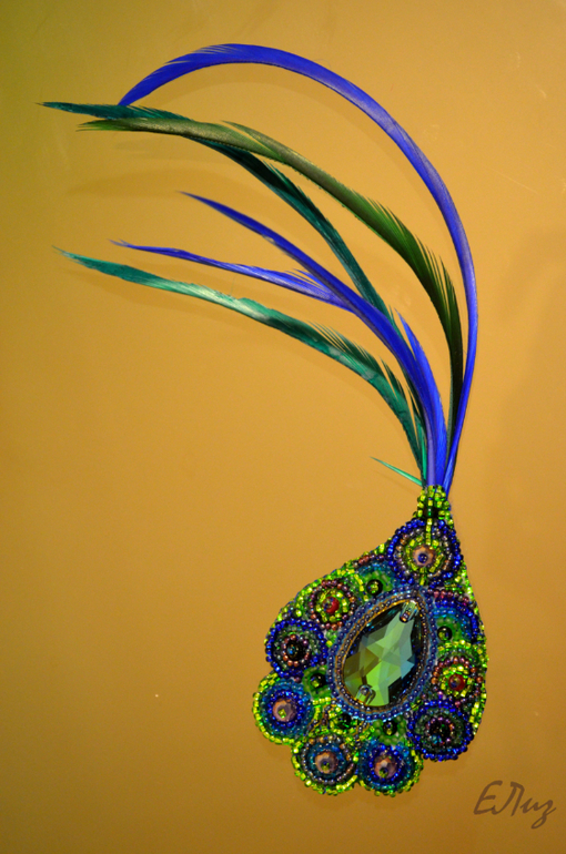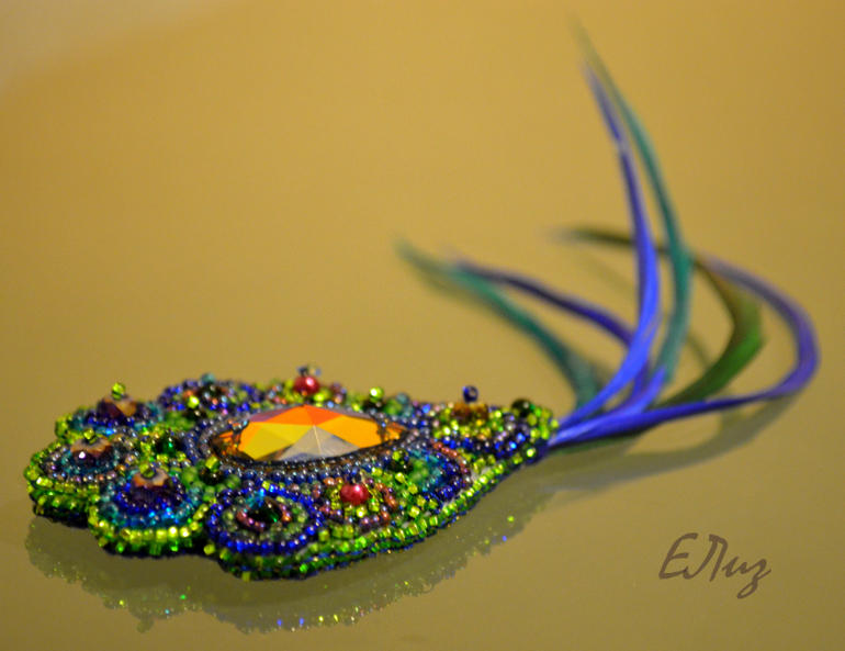 При создании броши также использованы бусины различных оттенков и размеров, 8 видов бисера, перья.