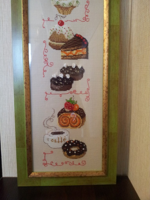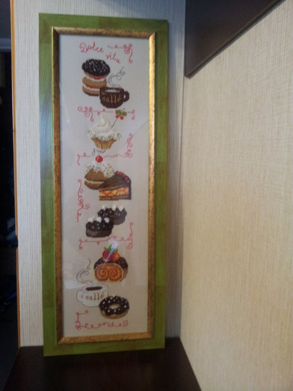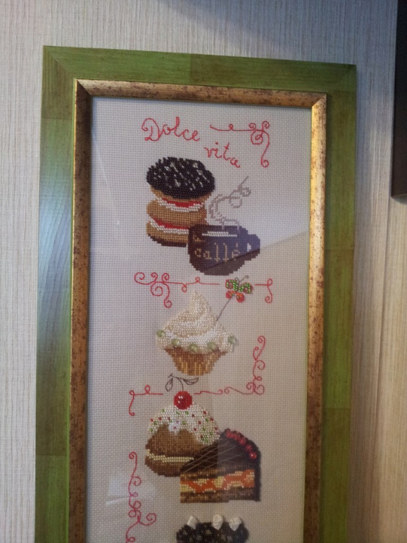 Приветствую, рукодельницы! Хвастаюсь вам своей наконец-таки отшитой работой, история у нее долгая, она побывала со мной аж в Сибири, застала рождение сыночка, потом приехала в Питер и здесь была окончена и оформлена. Итак, Риолис "Сладкая жизнь":