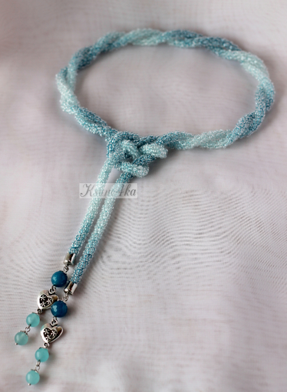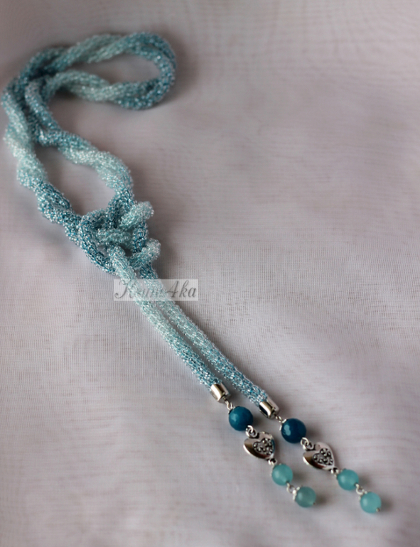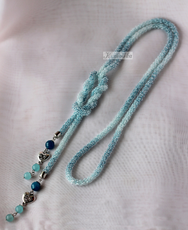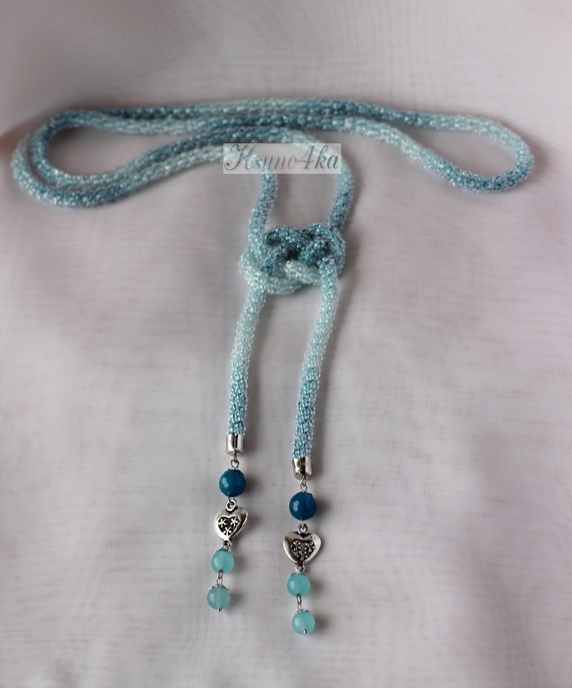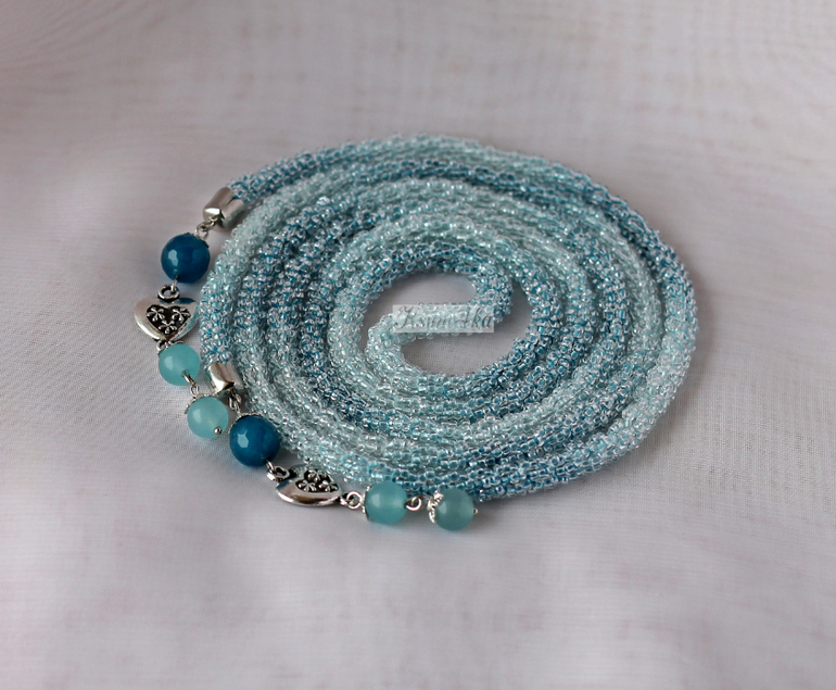 Лариат "Холодное сердце" связался на одном дыхании. Выполнен из хлопковой меланжевой пряжи с использованием чешского прозрачного бисера, бусин тонированного агата и фурнитуры под античное серебро.