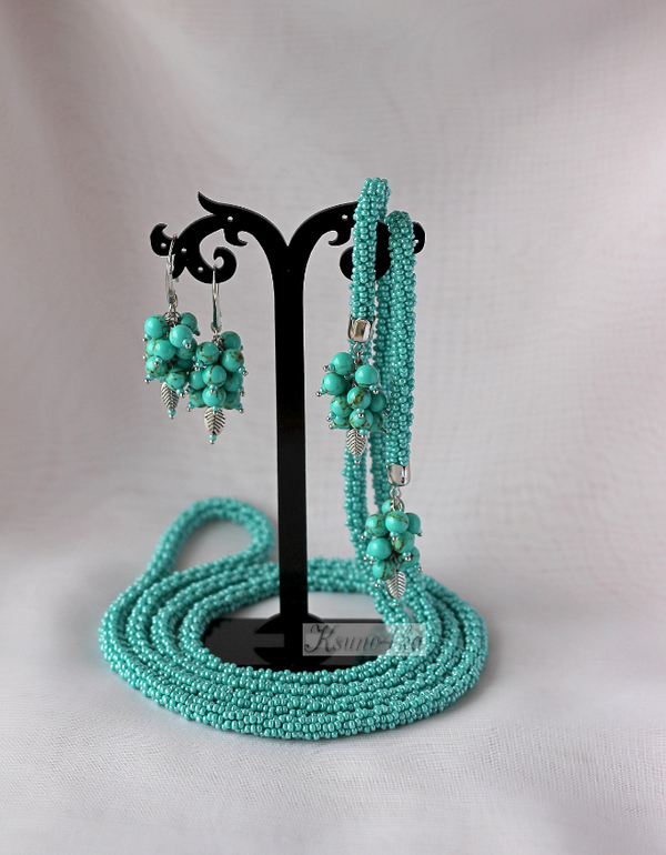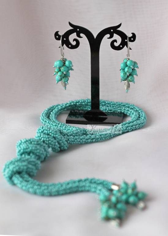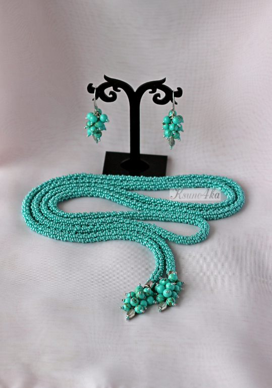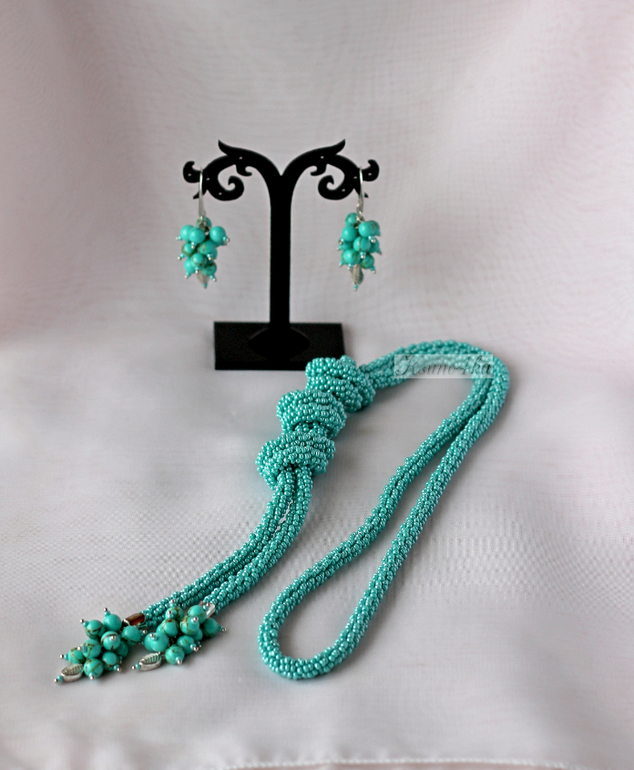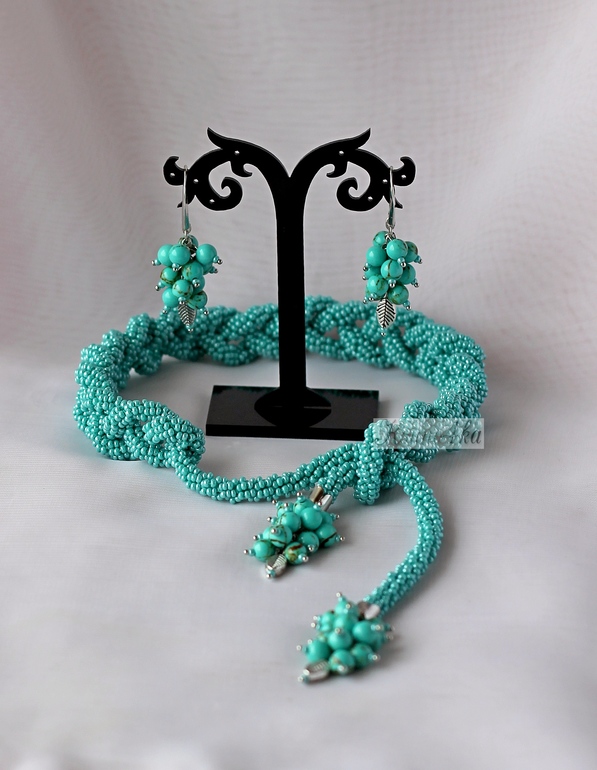 Комплект состоит из лариата и пары серёг. Использованы чешский бисер, хлопковая пряжа, бусины бирюзы, фурнитура под серебро.