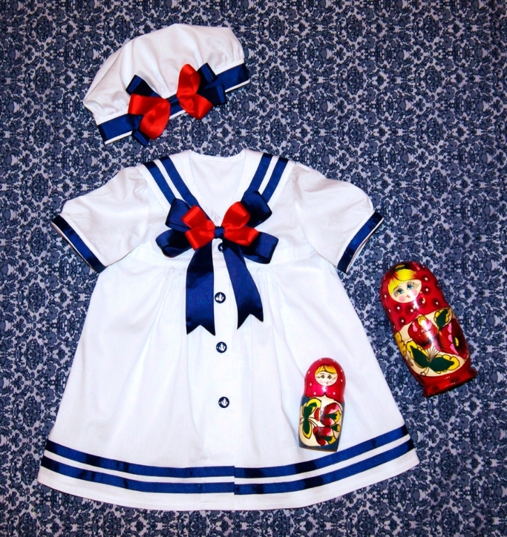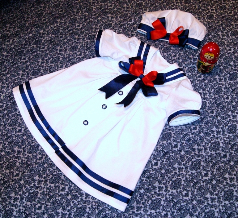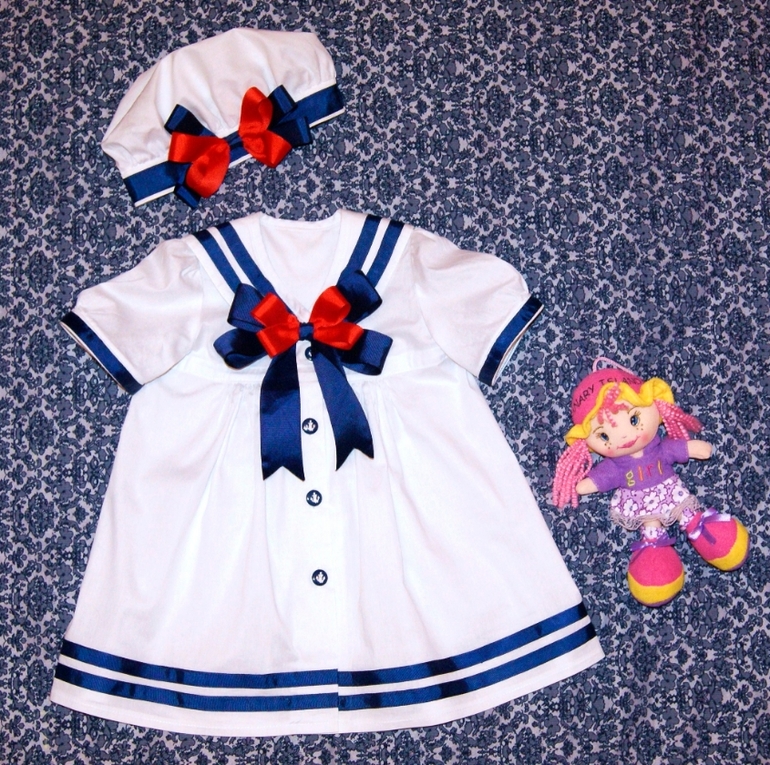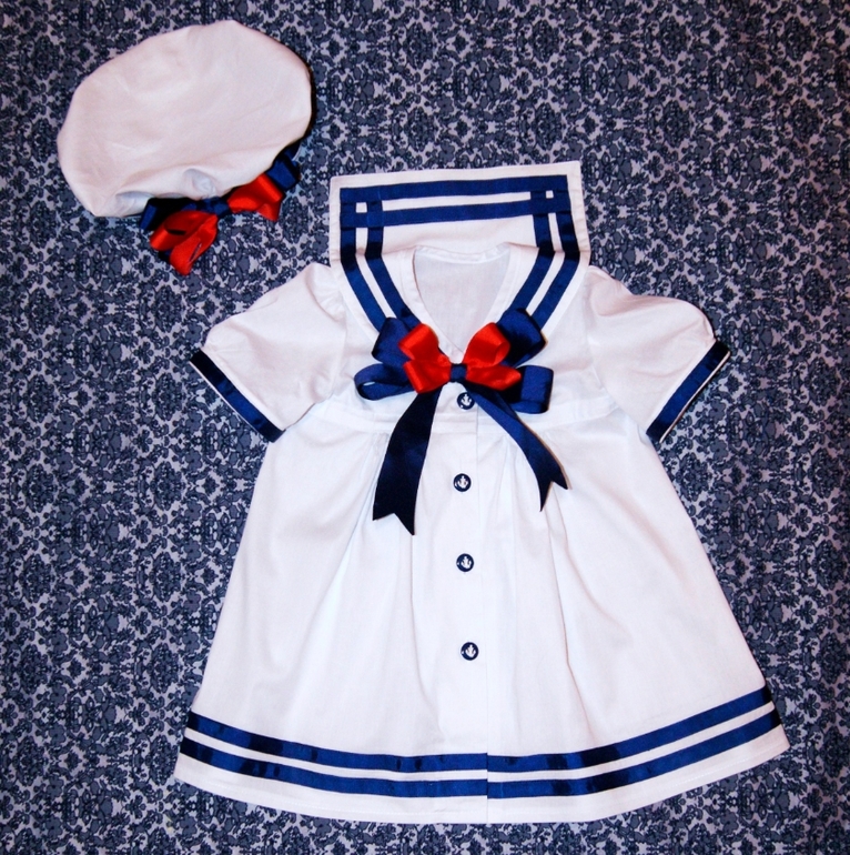 Шитье одежды, выкройки, ремонт одежды, шторы, швейные машины (уже приобретенные)Еще один вариант "маленькой морячки" из очень тонкого, мягкого, белого поплина для малышки на жаркое лето или отдых на море. (шила на заказ, 86 размер). Комплект украшен репсовой лентой, бантами и пуговками "якорями". Воротничок, манжеты, планка и ободок береточки укреплены дублирином. Под бантом на полочке потайная кнопка.