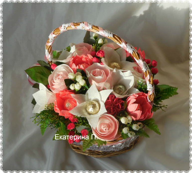 Катя, корзина просто прелесть. Я если честно занялась плагиатом. Делала букет на заказ. Уже сделала половину цветов, поехала за бумагой, а нужных цветов нет. Вообще никаких нет, кроме зеленых и синих.Чуть не ревела. Отчаялась, все бросила. Просто села смотреть ленту. Увидела Вашу работу. А у меня и бумага такая есть в остатках. И вроде должно хватить. Получилась такая красота, что отдавать не хотелось.Спасибо, что вы, сами того не зная, просто спасли ситуацию.PS Такие розы делала первый раз. А цветочки типа пионов сделала другими, т 22954680104654470e87d7443d5ddc81.jpg к уже времени не было совсем