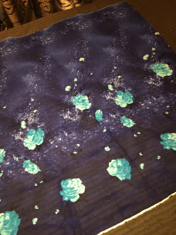 Итальянская ткань, состав не знаю похожа на плотный шифон (не утверждаю) цвет на фото получился фиолетовый, на самом деле насыщенный синий.137х140см