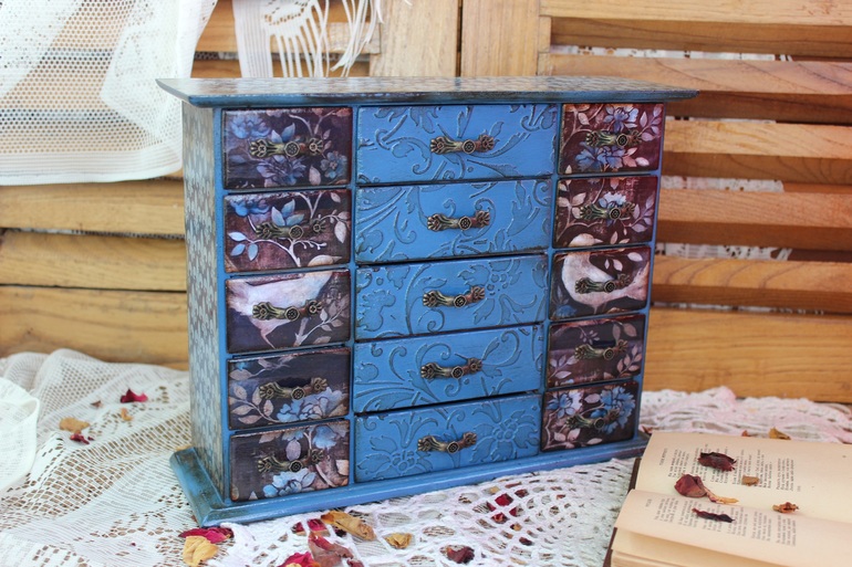 А я обожаю синий! Очень красивый получился!!! Единственное, я бы на боковых ящиках (с птичками) ручки заменила на одной ножке.) Надеюсь понятно.))))