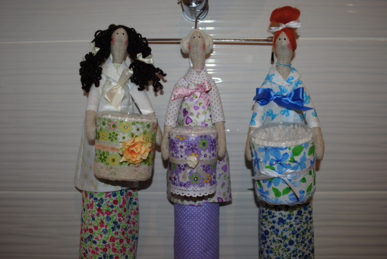 Вот такие сшились у меня хранительницы ватных дисков и палочек - брюнетка(Мария0, блондинка(София) и рыжая(Сюзанна). Прямо группа "Виагра"