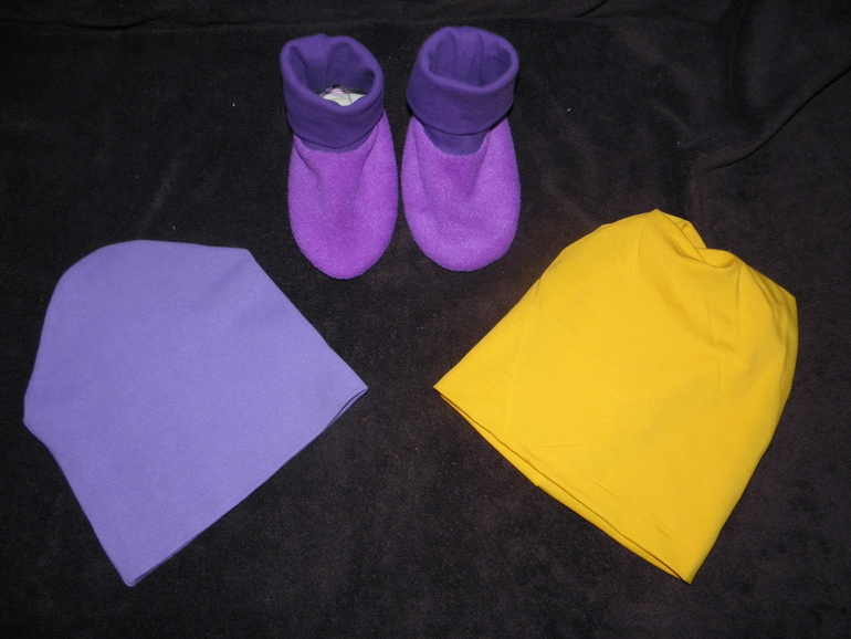две трикотажные шапульки,одна плотненькая,на более прохладныю погоду,а вторая тоненькая и тапульки для дома