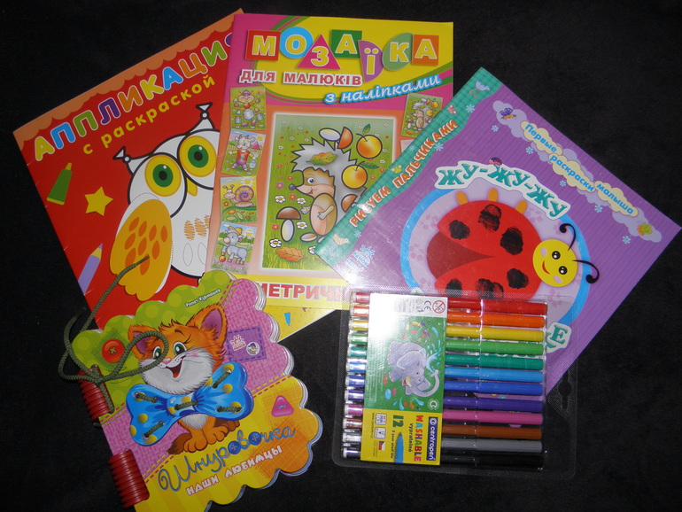 ну и конечно же ещё куча подарков для Васюши!тут и шнуровка здоровская,и фломастеры(смывающиеся,за что отдельное спасибо)),и раскраски(и тут не без божьей коровки)))!