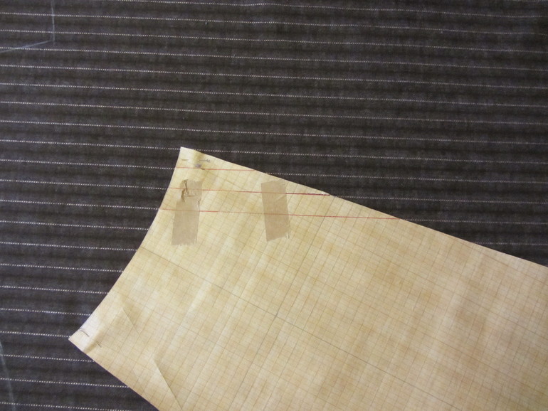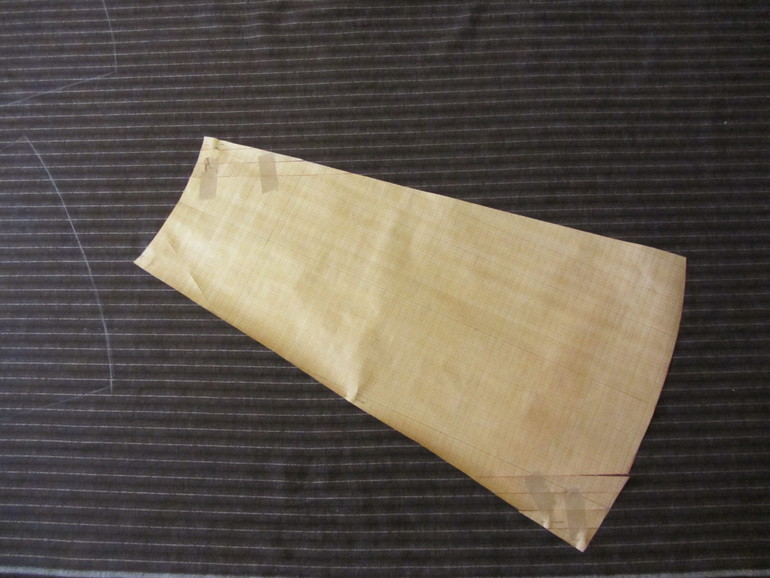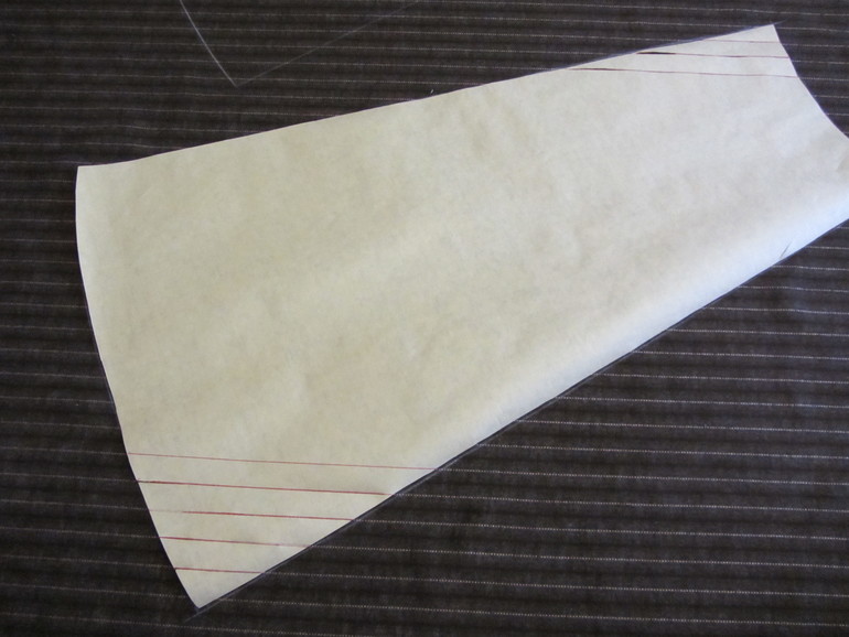 Закрепляем булавками и обводим выкройку. Далее надо полосы на бумажной выкройке как бы продавить, так чтобы их было видно с обратной стороны. Только не перестарайтесь, бумага может порваться, как у меня и случилось)) Делаем это в двух местах (в верхней части выкройки и в нижней), для контроля.