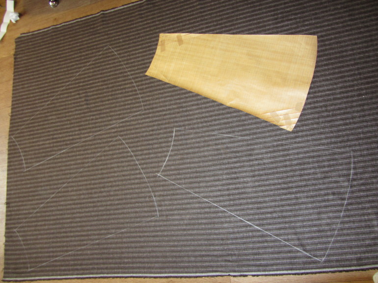 Обрисовываем выкройку. Далее передвигаем ее, при этом следим чтобы полосы на бумажной выкройке совпадали с полосами на ткани