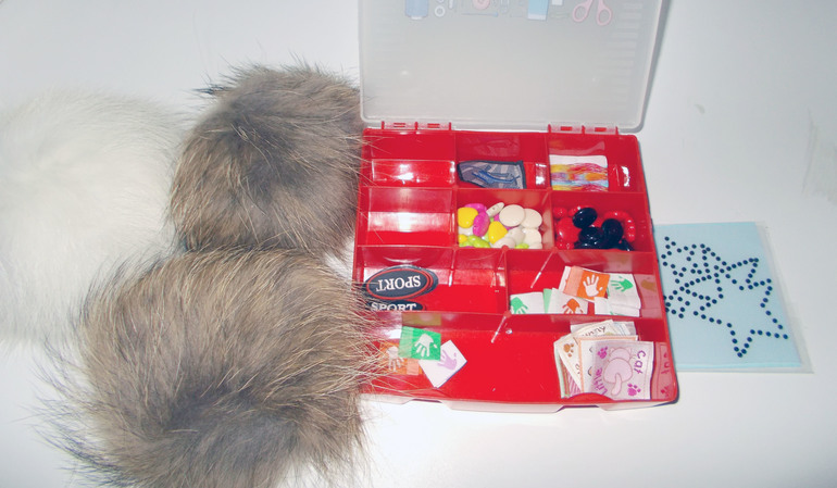 На следующий год свяжу шапочки мальчишкам и себе с Надюшиными пампонами. В коробочке очень много нашивок разных, бусинки, все пойдет в дело)