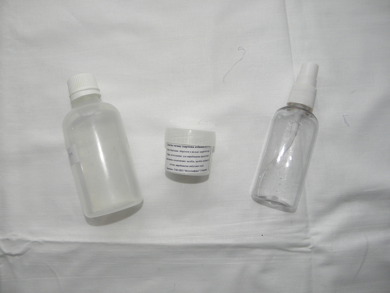 Флакончик под спирт с небольшим количеством спирта,бутылочка с распылителем для спирта и диоксид титана
