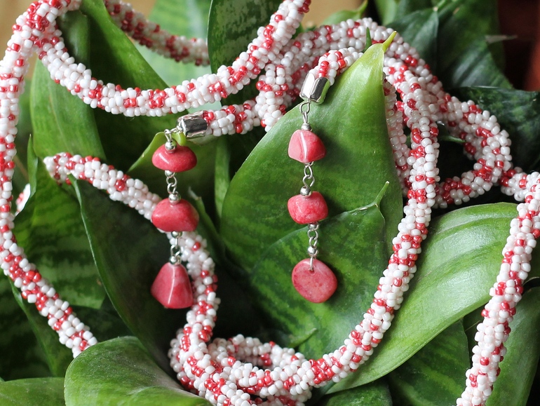 Длина 154 см + 6 см каждая подвеска. Для подвесок использованы натуральные сколы родонита, фурнитура под серебро.