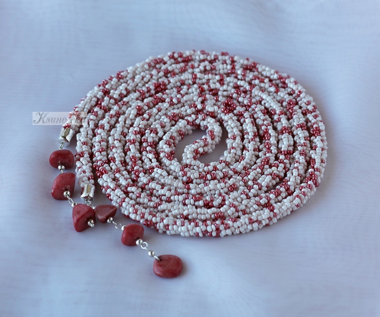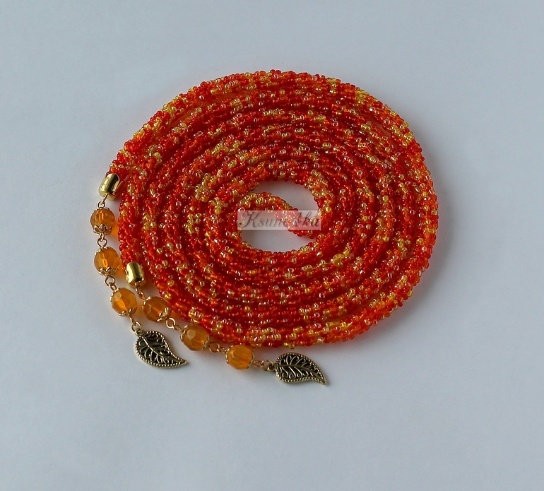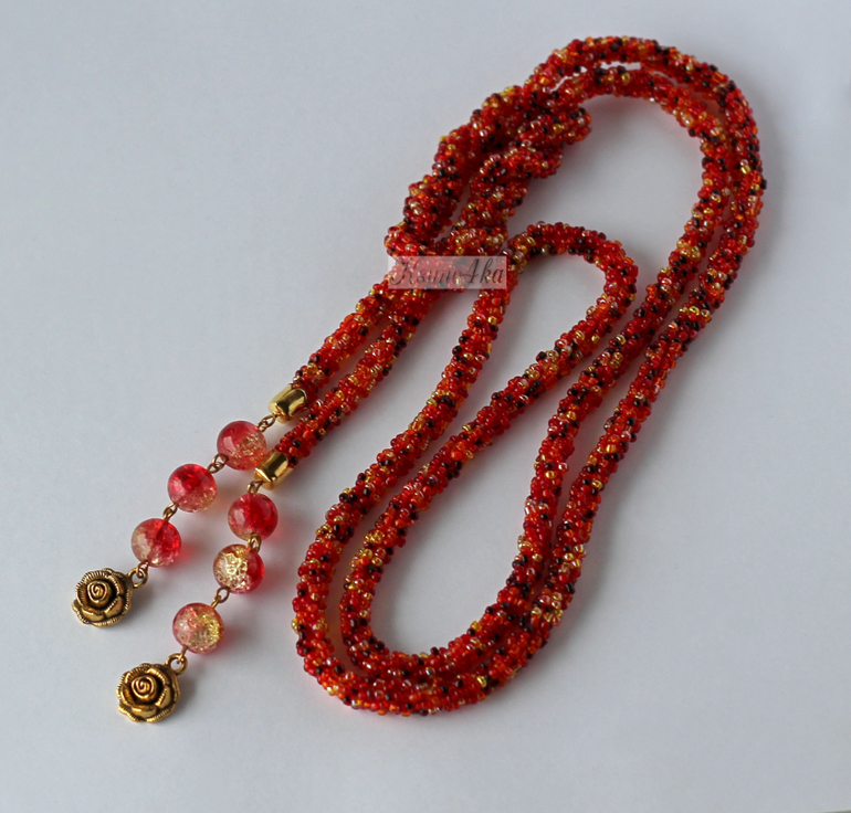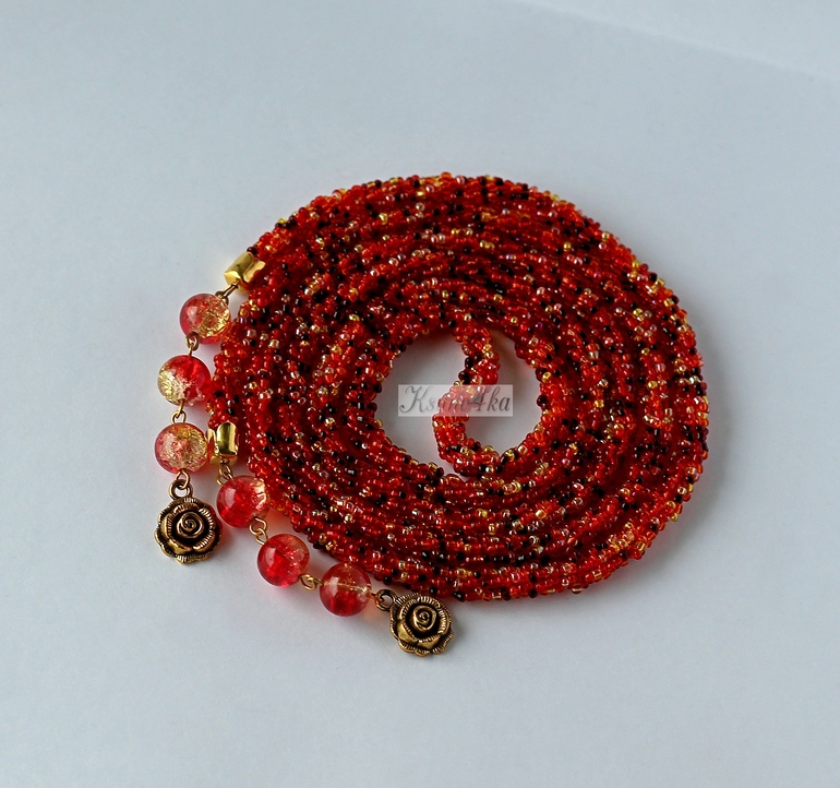 Лариат "Алый" получился в результате смеси нескольких видов красного, оранжевого и капельки жёлтого бисера. Дополнен бусинами кракле, фурнитурой под золото.