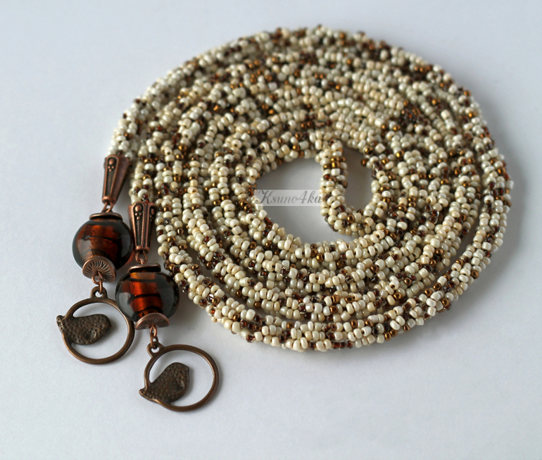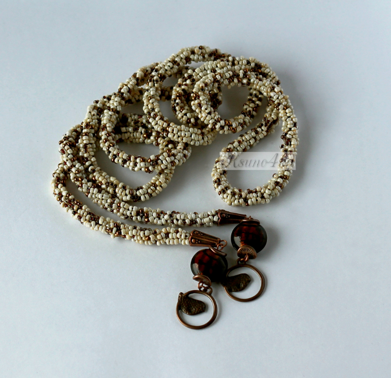 Первый из них - лариат "Рябчик". Для его создания мне понадобилась смесь бисера, хлопковая нить, бусины ручной работы и фурнитура под медь.