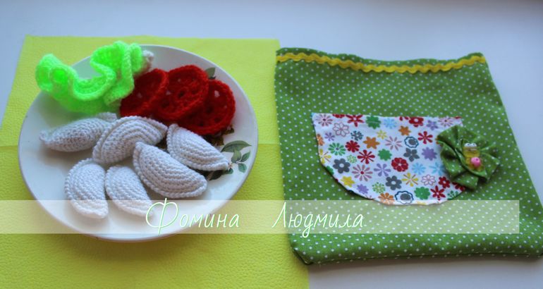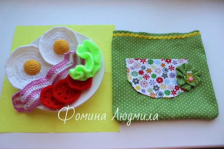 Первая конечно на очереди моя любимая крестница Полина . специально для нее я связала набор "Завтрак большой " Яичница ,бекон ,сосиски ,листик салата ,помидоры + обед немного вареников .Плюс конечно веселенькая сумка .