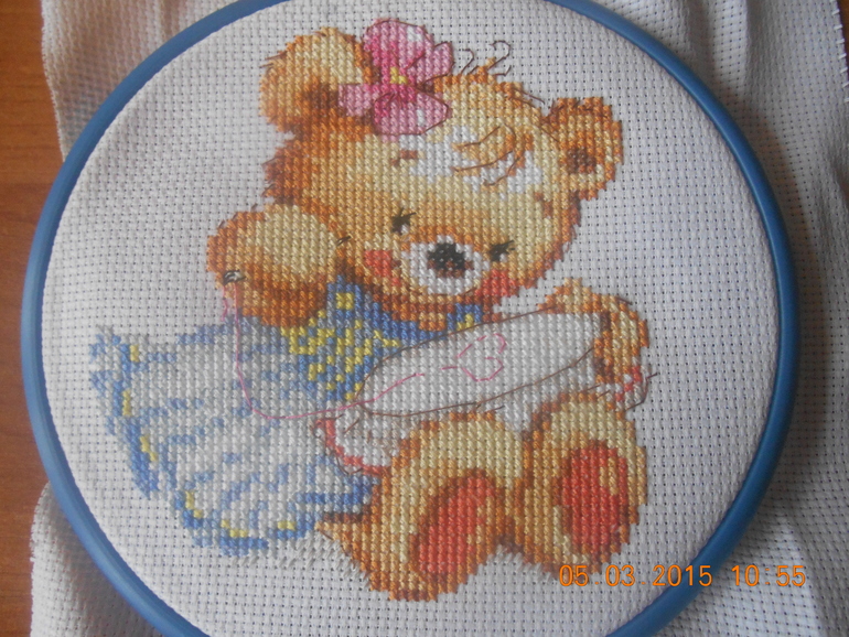 Доброго всем времени суток.Что то я так расстроилась...Очень люблю вышивать "Алису",вышиваю серию медвежат.Вот,может мне кажется,но юбочка у моей мишутки какая то серая,незаметная...Другие нитки.Должны быть светло голубые,а на деле блекло серые. Посмотрите,пожалуйста,оцените.Должно быть (внимание на юбочку)