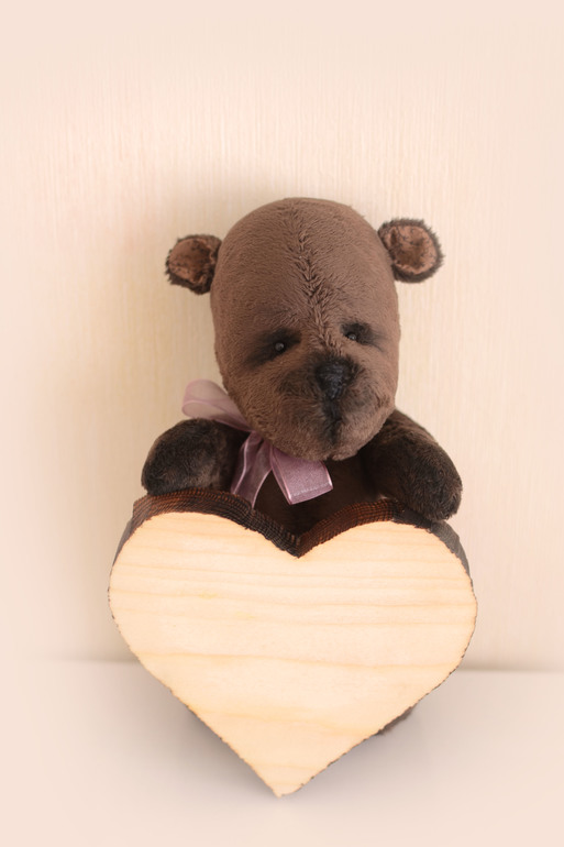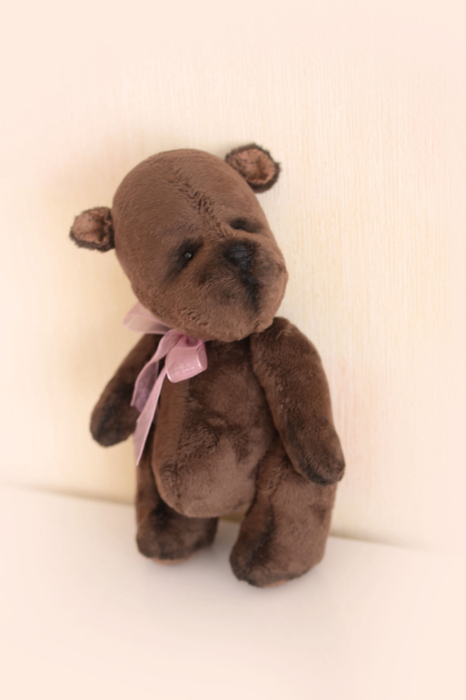 Малыш сшит из нежного плюша, глазки стеклянные, носик вышит, ростом медвежонок 22 см., умеет хорошо сидеть и стоять с опорой, лапки и голова на шплинтах и двигаются.