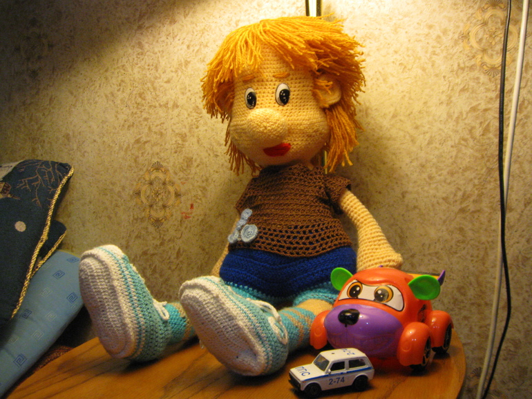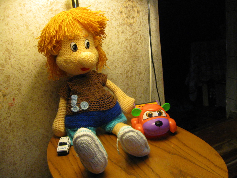 Связала для сына вот такого дружка. Зовут его Простоквашка. Рост - 62 см. Имя не придумывала специально, а вспомнила его из детства... но не из своего, а из детства брата (которому в этом году будет 39 лет!).