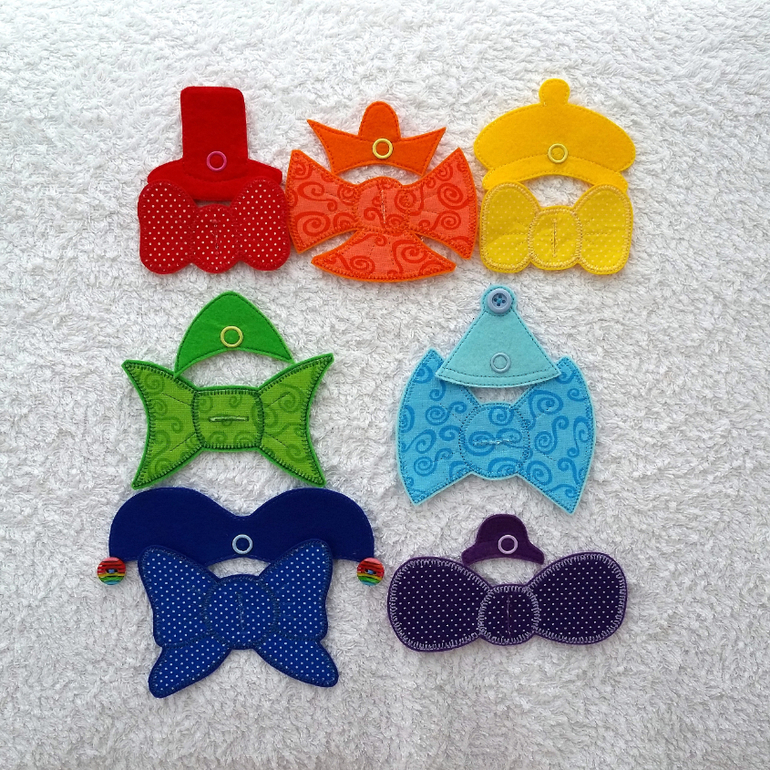 Страница задумывалась как обобщающая и закрепляющая. Подбираем по цвету шляпки и банты. Шляпки на кнопке, банты на пуговке.