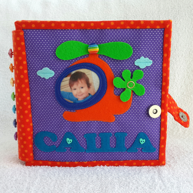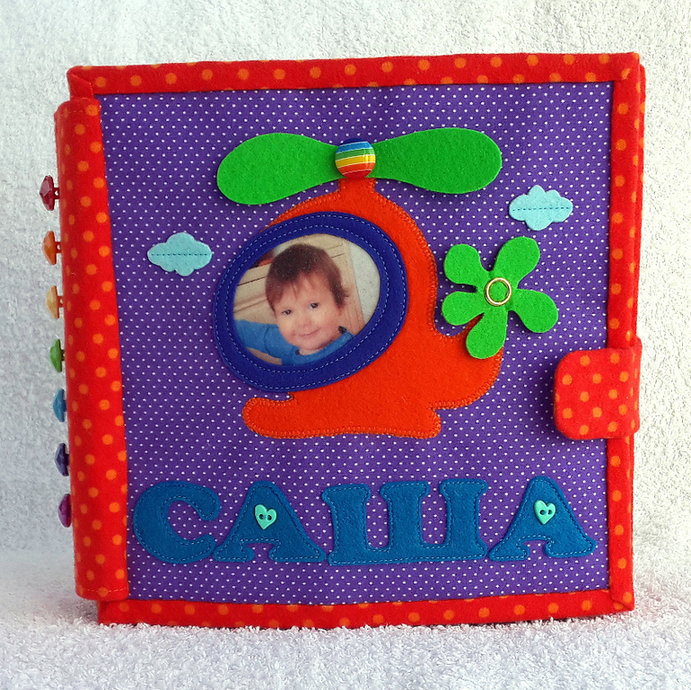 Обложка - вертолет с фотомордочкой. Пропеллер на пуговке пришит, хвостовой на кнопке - можно покрутить и отстегнуть.