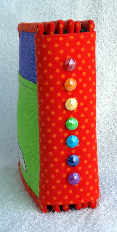 Корешок украшен пуговками по цветам радуги. Сзади кармашек для хранения всего, что открепляется.