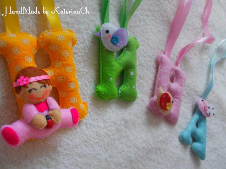 и её дочки Ниночки. Высота буковок 10 см. Украшены фетро-игрушками: малышкой и птичками.