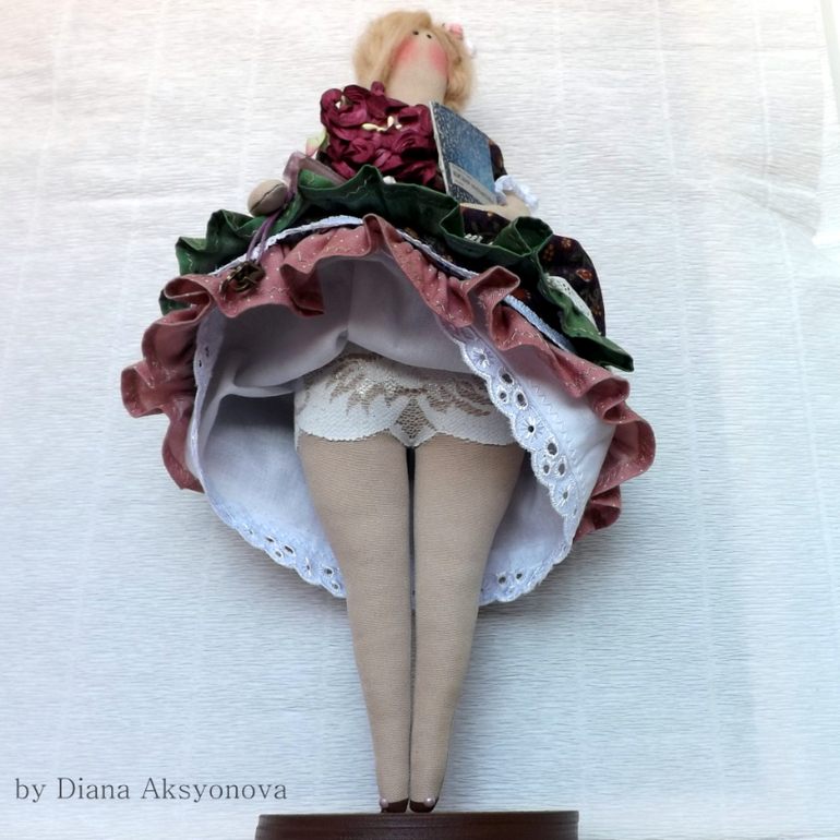 Барышня сшита на заказ. На выставке со мной была кофейная барышня и девушка, увидев её-сказала:"Мне такую же, в таком платье, на подставочке, только волосы чуть темнее и какой-то предмет, указывающий на профессию!" По-этому чуть изменила платье (невозможно же один в один шить, совсем неинтересно))), в руках учебник и шнурочек с цифрами)