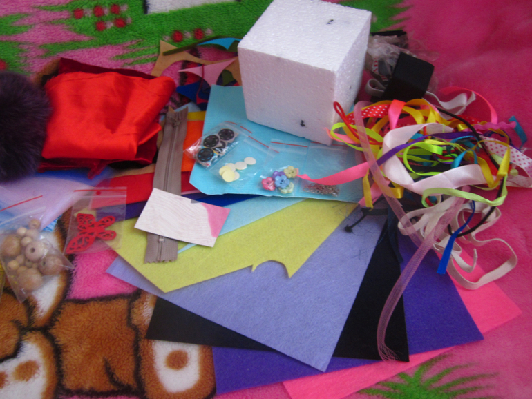 -замочек, пуговички, крючки с петлями, липучка(кружочки с жесткой основой и отрез велькроткани с мягкой основой; ленточная липучка черная), кнопки, бусинки, пайетки, подвесочки, кусочек безопасного заркала(можно вырезать ножницами любую форму);резинка-шнурок, а также отрез бельевой резинки и резинки шириной 2,5 см.