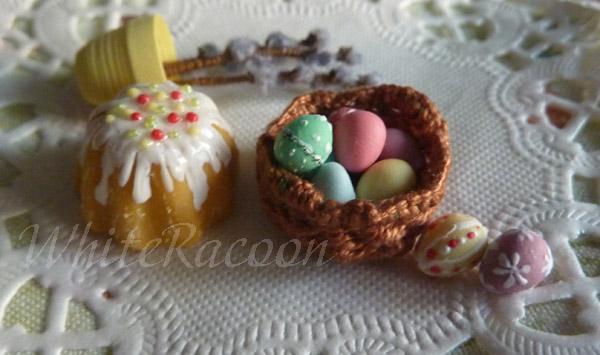 Лепка из пластики (полимерная глина) (ТОЛЬКО ГОТОВЫЕ РАБОТЫ)Из флористической глины, продолжаю эксперименты для Сильванчиков. Размер, наверно, близок к 1:12. Кулич, писанки-крашенки, верба. Кулич 17мм х12 мм, яйца по 6 мм, корзинка 19 мм, верба 35 мм.