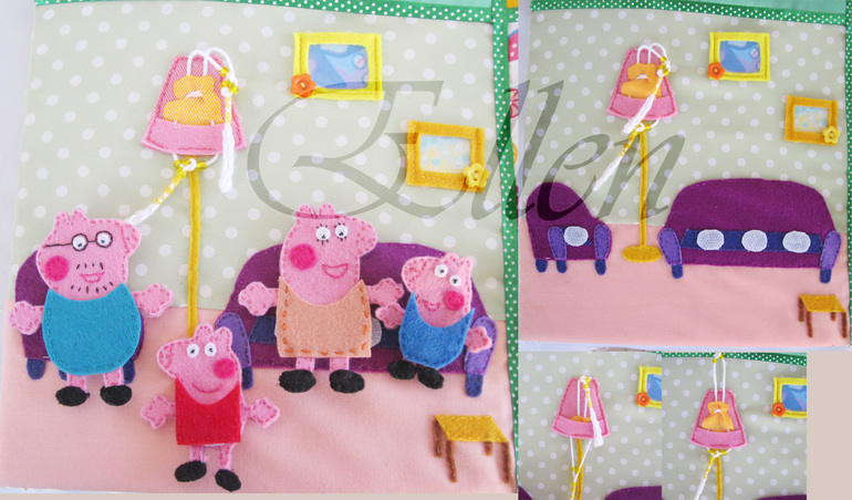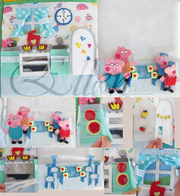 Гостиная. Персонажи на липучках,садятся на диван и кресло. Светильник "включается" и "выключается".Картинки на стене можно поменять,изображение вытягивается и ставится другое.Кухня. Персонажи,чашки на столе на липучках. Все двери открываются,по 2 полки в каждом шкафчике,а также в холодильнике.Духовка тоже открывается. Пейзаж за окном можно сменить.