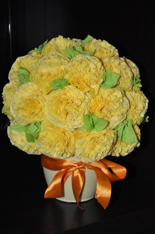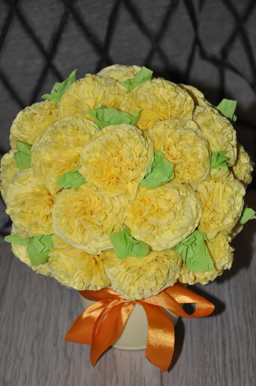 Надуваете маленький шарик, размер сами решайте какой, это зависит от горшка или емкости в которую вы букет потом приделаете) я купила простой пластиковый горшок. Размер потом еще и увеличится за счёт объемных цветов. Разводите клей ПВА с водой ( воды не много) и рвете простую бумагу для принтера на кусочки и эти кусочки накладываете на шарик и промазываете их сверху клеем. Так несколько слоев. И кладете на горшок сохнуть. Сохнет дня 2! Когда станет жесткий шар то лопаете воздушный шарик и вытаскиваете. Берете салфетки ( те что многослойные) какого цвета хотите и сворачиваете их в квадрат, посередине закрепляете степлером. Потом вырезаете кружочком. И самое муторное)))) разбираетесь слои загибая их вверх к середине. Потом клеете шар к горшку и обклееваете цветами, ряд за рядом начиная с нижнего)