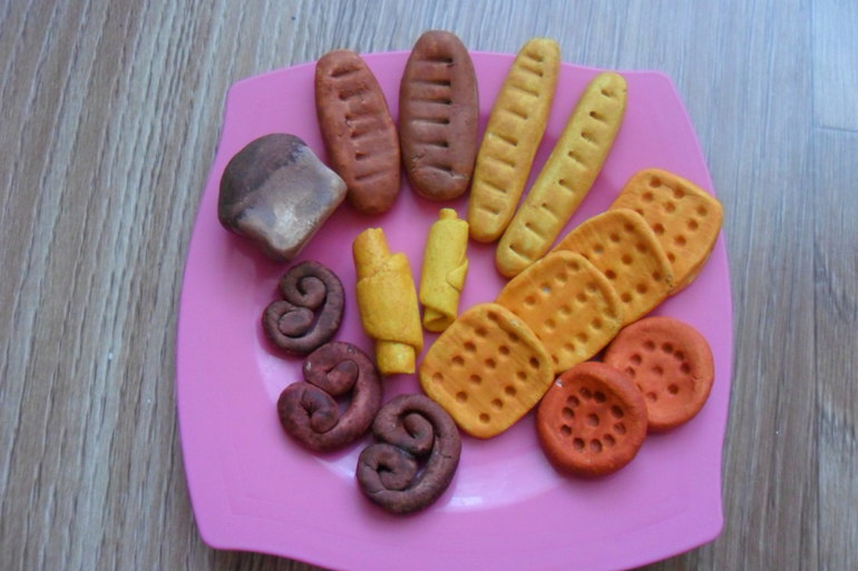 Пока только хлебобулочные изделия и овощи которые растут в земле,уж не знаю почему то захотелось еще и тыкву,она то не растет в земле,да ну ладно... В чем же универсальность...а в том что мы не только кукол кормим,но и сажаем огород,в пластилиновую землю,очень развивает мелкую моторику.Фото поближе