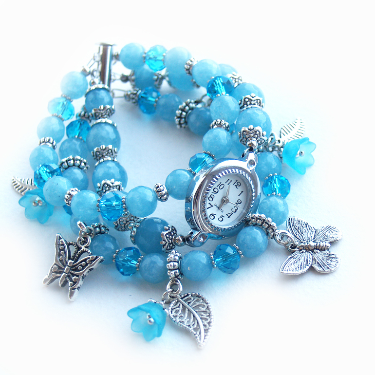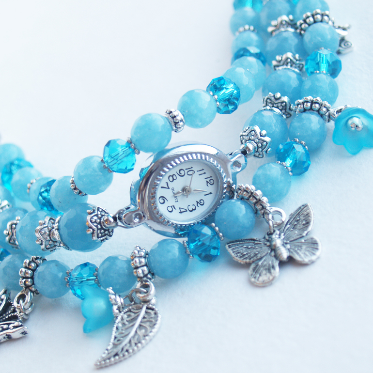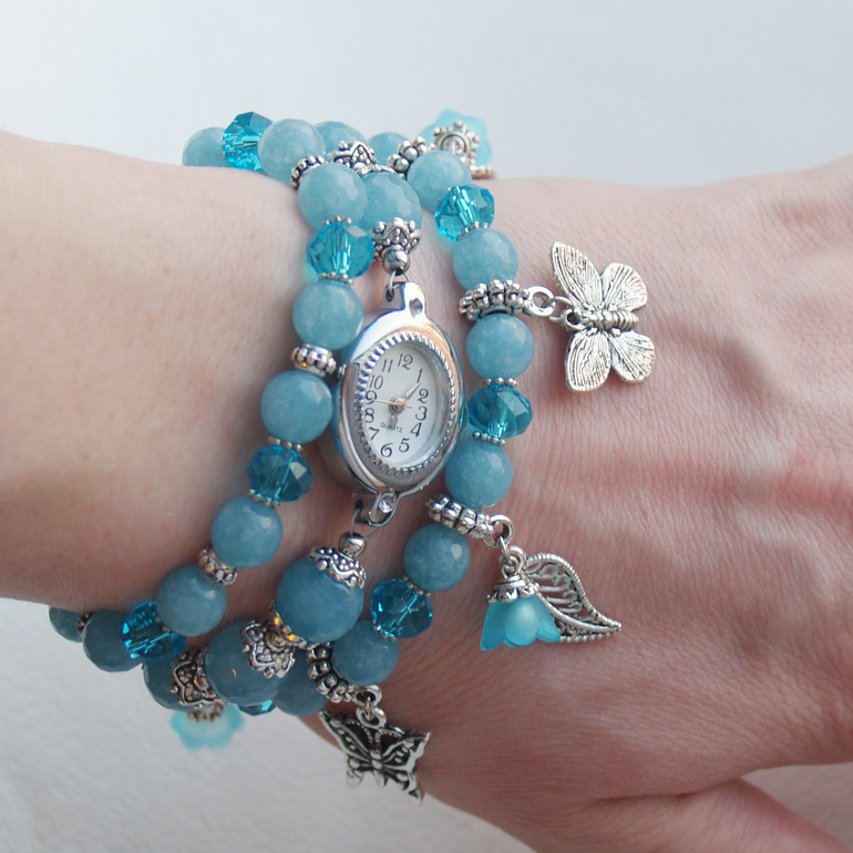 Часы состоят из трех рядов, собранных из бусин голубого агата.