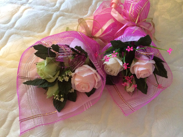 Не нужно никакой третьей розочки. Я полагаю Вы пытались изобразить букетики из моего последнего поста. (Извините, если ошибаюсь, но больно похоже) Так вот предлагаю и дополнить их конфетами, чтобы букетик казался гуще. И уберите сетку из букетов, я имею в виду петельки, которые Вы в сам букет вставляете, видимо, для декора.
