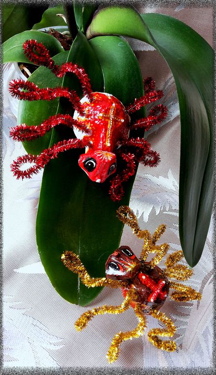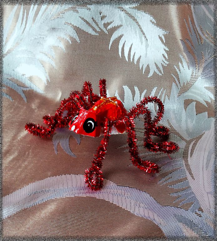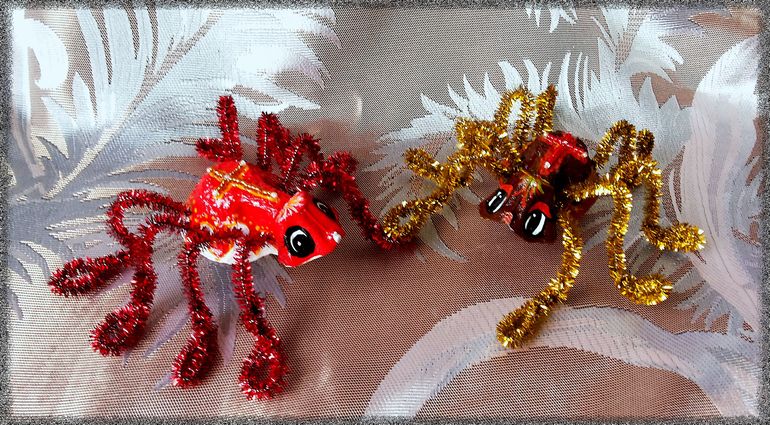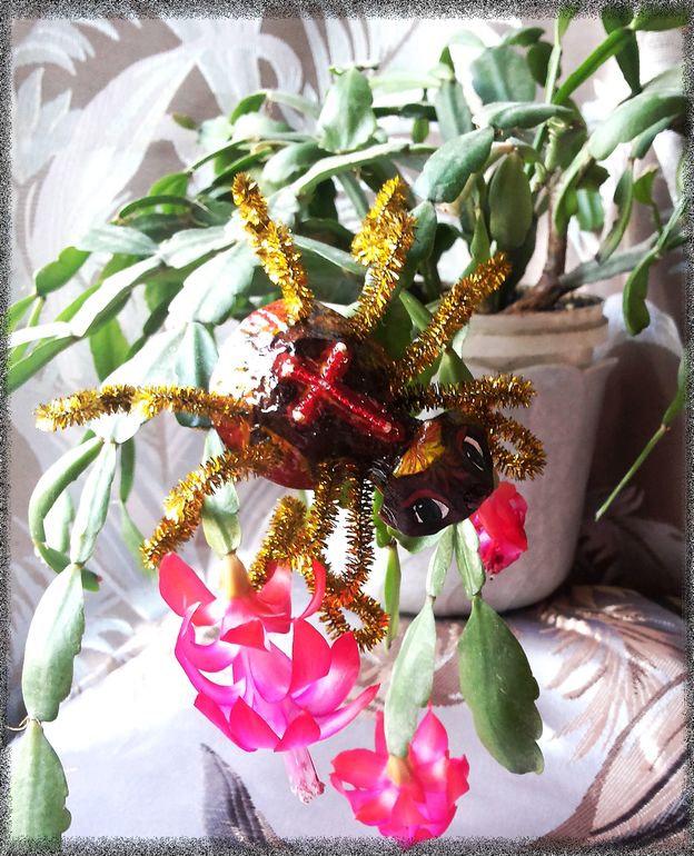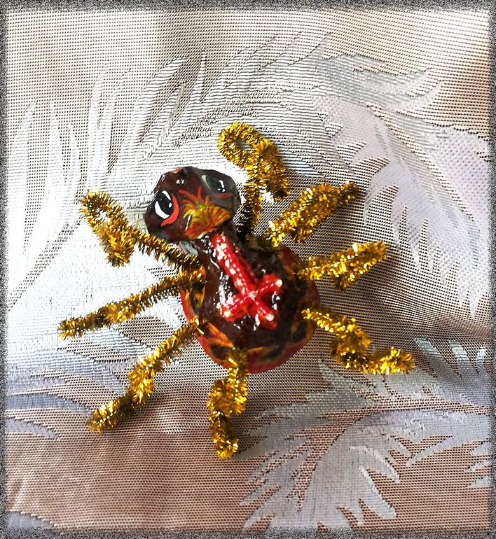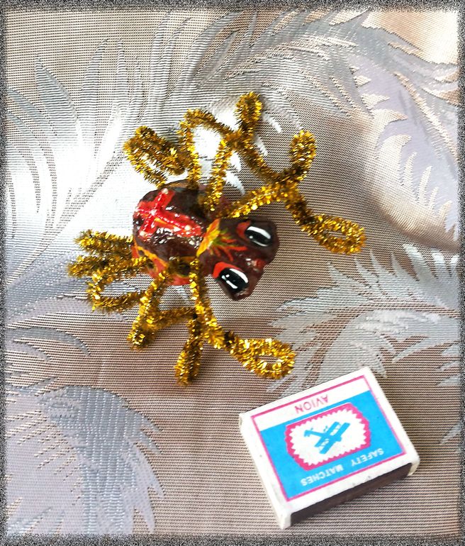 Поделки с детками.Попросили намедни сделать в садик любых насекомых(которых я, кстати сказать, терпеть не могу))). Вроде бабочку вначале решили сделать... но этим же вечером я купила яйца, в упаковке 20-ти штучной, так вот и натолкнула меня эта упаковка на мысль: это же готовое тельце для паучка! Сказано - сделано, вырезала тельце, головку из той же упаковки приклеила, синель для ножек дома валялась уже давно, купленная мной в порыве хомякоза непонятно зачем... ну, мысль пришить на спинку крест из бисера в процессе посетила, и вот... А, да, красненького красила дочка, я уже узоры и все остальное доделывала...