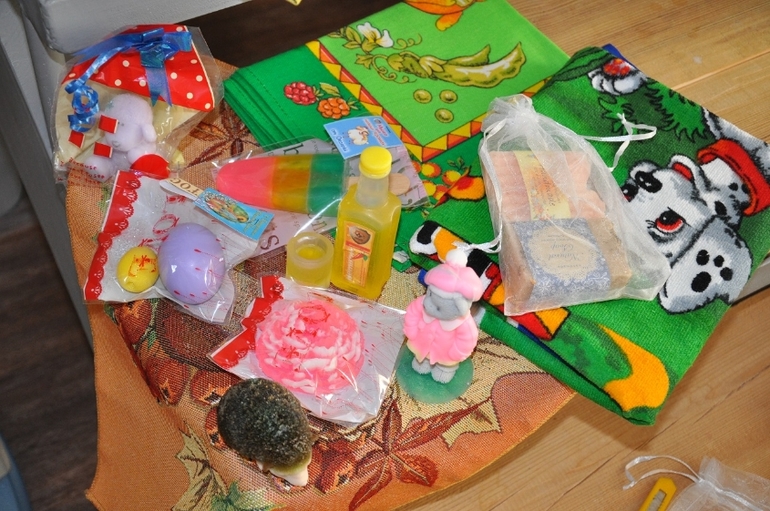 Еще чаек нашему папе, полотенчики мне, Ксюшины рукоделочки-чудесное мыло и улиточка, хомячьи радости.