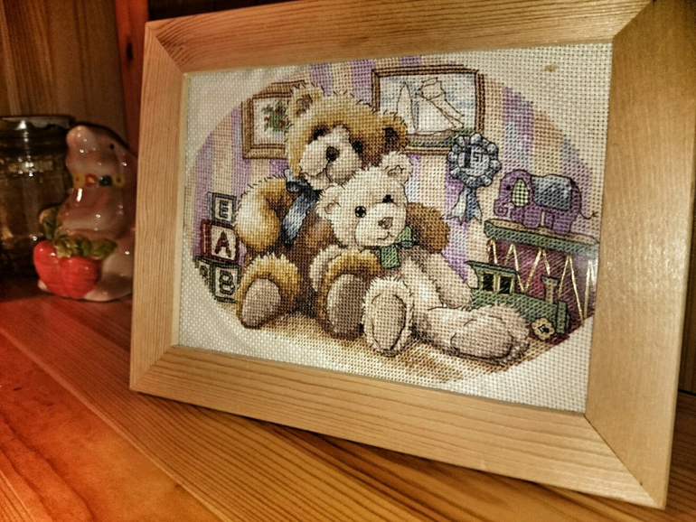 Я бы в рамку с паспарту бы оформила, а паспарту овал под мишек чтобы было.