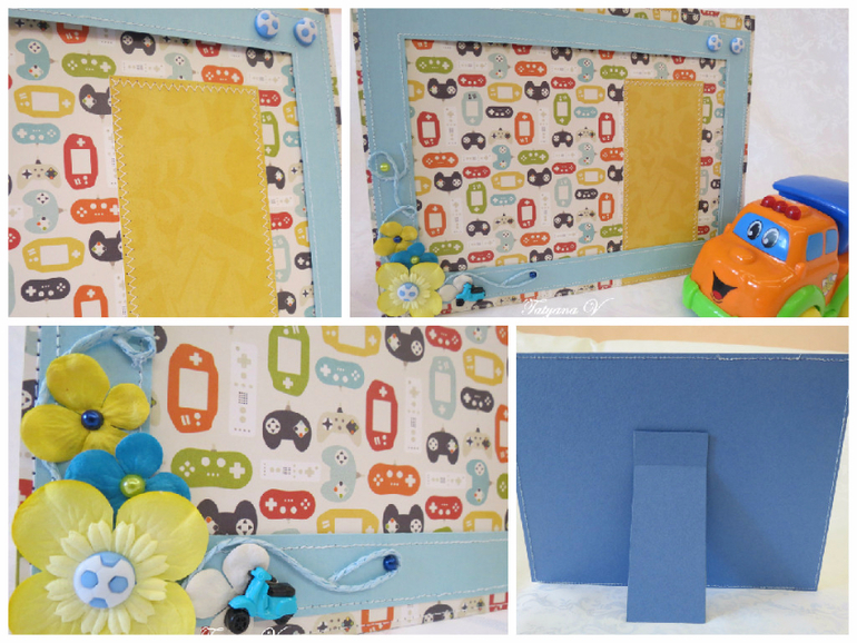 СкрапбукингРешила сделать рамку под большое фото 20*30. В основании плотный плотный картон 1,5мм. Хотела сделать футбольную тему, но подходящей бумаги не нашла. Вот такая веселая рамка получилась.