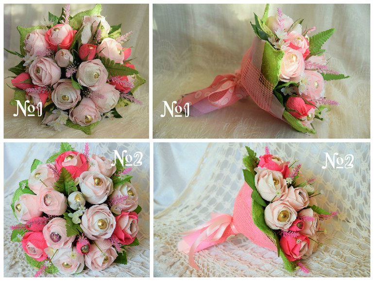 и второй букет, повтор. Показываю как коллаж - №1 первый букет, №2 повтор. Почти похоже, только сетку во втором от души навертела и каркасы разные. А и еще во втором частично конфеты, частично чай связанный в цветах. А так да, одинаааковые)))))))))))))))