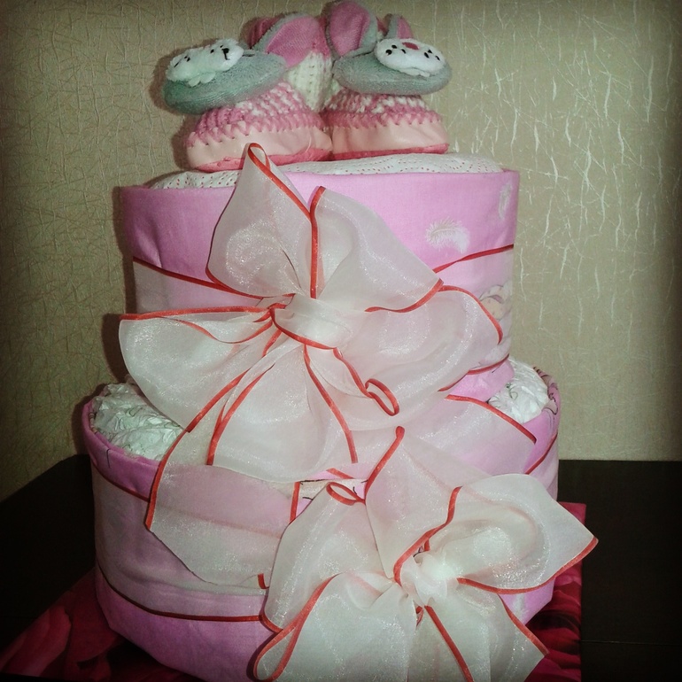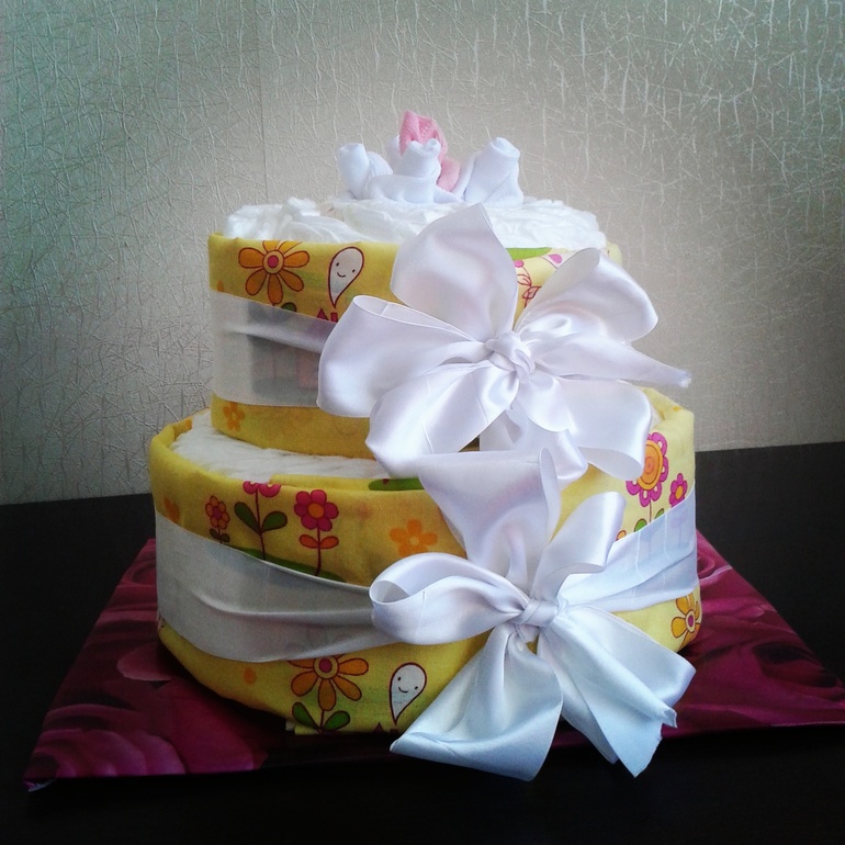 Наткнулась как-то в интернете на фото тортиков из памперсов, захотелось сделать такой оригинальный подарок. Вот что из этого вышло:
