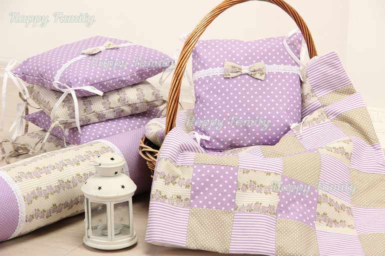 Комплект в кроватку малышки состоит из 6 бортиков-подушек (3 в горошек с хлопковым кружевом и бантиком и 3 с розочками); лоскутного пледа и валика в кроватку. Кружево получила в подарок от своего любимого поставщика тканюшек и оно просто отлично вписалось!