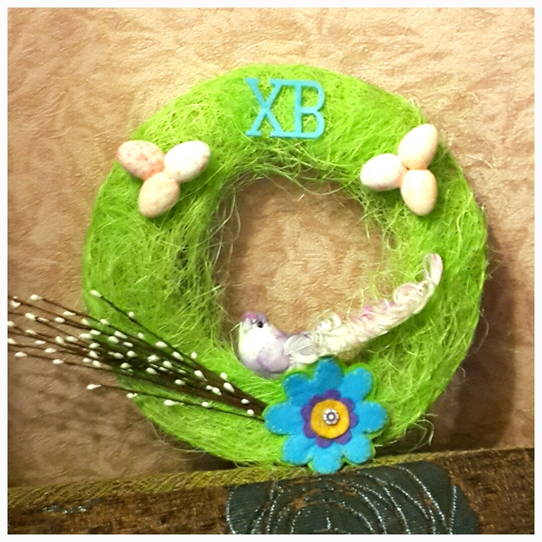 :) спасибо!Я из картона вырезала основу венка, дальше обмотала бечевкой коричневой, это для того, чтобы потолще был.Сверху прикрепила сизаль зеленую, по краешку прихватила немного нитками зелененькими. Ну а остальное было куплено в фикспрайсе, цветок из фетра сами сшили и все это дело на клей пистолет :)