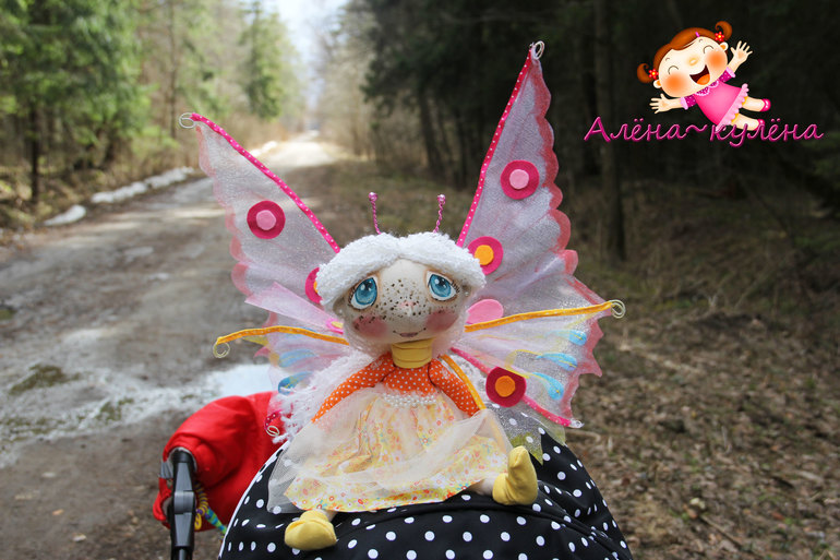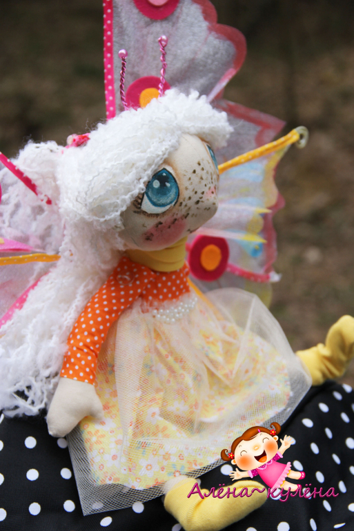 В этот раз выставляю на Ваш суд белокурую девочку-бабочку, зовут малышку Ассоль, ростиком - 30 см, девочка сидит самостоятельно, не стоит, одета в солнечное платьишко, да и вообще солнышко ее любит...крылышки снимаются...