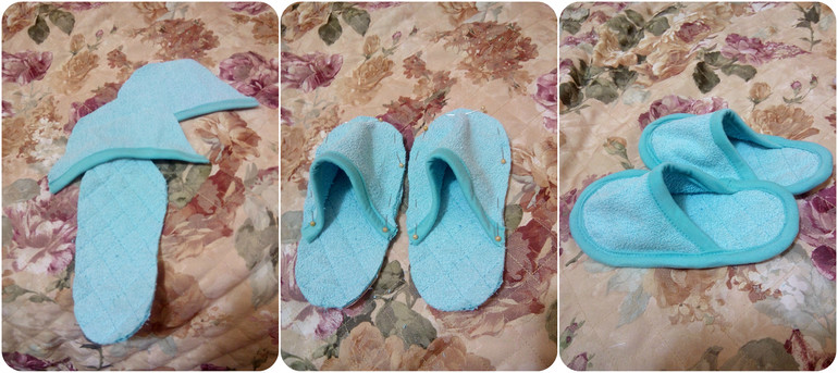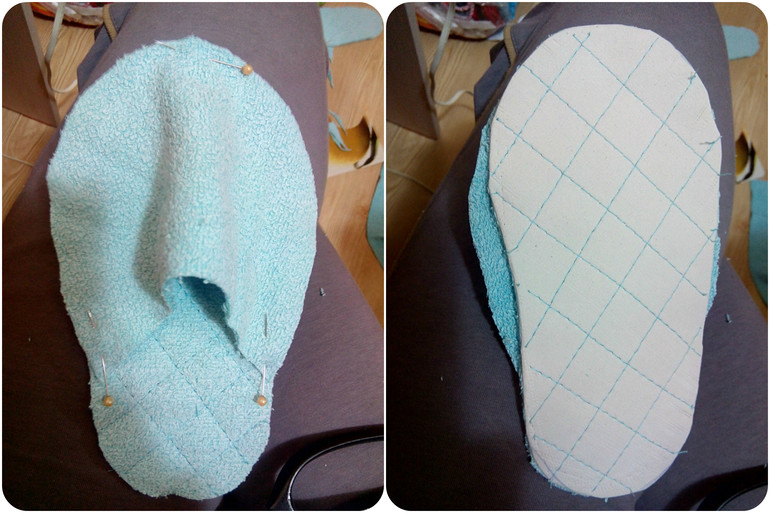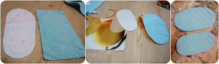 Обвести ногу дитя, выкроить четыре детали из полотенца и две из... не знаю, как назвается, из какого-то вспененного материала салфетки на стол под тарелки, стаканы... или что-то еще непромокаемое. С припуском примерно в 1,5 см. Белой нескользящей стороной наружу, простегать, обрезать неровный от стежки край.