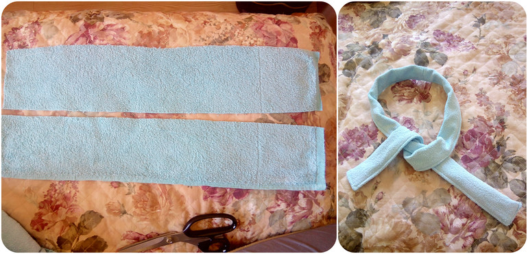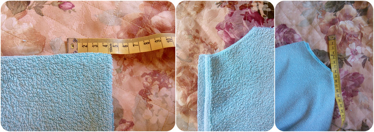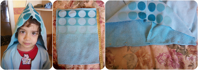 Вывернуть, примерить на модель, отрезать. У меня 29 см. Пришить к халату. Если длина пришиваемой стороны капюшона больше длины горловины, забрать разницу в задний шов капюшона, у меня 1см убрался.