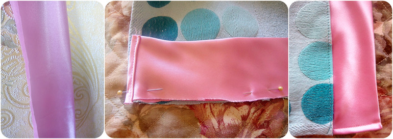 Окантовка горловины контрастным атласом. Лента шириной 12см вместе со швами. Сначала ленту согнуть, прогладить, закрыть один торцевой край, который будет по низу халата, пришить к халату, закрыть второй торцевой край.