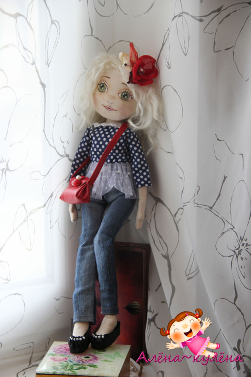 Одета...ох сколько же я пыхтела над одежкой и образом....вот бывает сразу видишь и образ и стиль....а бывает ходишь кругами и не знаешь как подступиться...вот с ней так же было...сразу знала, что она будет в джинсиках, а вот дальше - ступор...над этой девочкой я дольше всего работала...но надеюсь это того стоило! Итак, одета Алиса в синие прямые джинсики, блузка в горошек с баской из фатина и кружевным воротником, на ножках - туфли из кожи, аксессуары - красная сумочка из искусственной кожи на длинном ремешке, украшенная бусинами и воздушная заколка в в виде цвета в тон сумочке...Вся одежда СНИМАЕТСЯ!!!