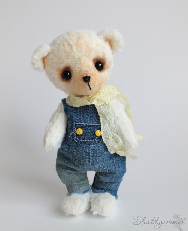 Игрушечный мир - животныеСпешу показать Вам нового малыша. Обаятельный малыш тедди по имени Теодор. Сшит по моей авторской выкройке из немецкой очень приятной наощупь вискозы белого цвета. Глазки словно живые - немецкое стекло. Все конечности подвижны (шплинтовое крепление). Рост 17 см. Умеет стоять и сидеть. Наполнитель: опилки и синтепон. Утяжелен металлическим гранулятом. Тонировка масляными красками. Комбинезон и шарфик снимаются.